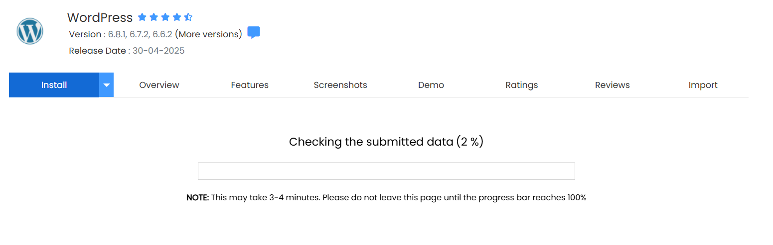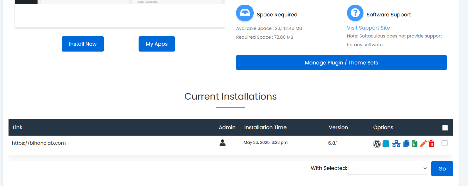 ৩। ক্লিক করার পর আপনাকে WordPress ইস্টল দিবার পেজে নিয়ে যাবে।এখানে আপনি প্রথমে WordPress ইস্টল দিবার অফশন পাবেন এবং একটু নিচে নামলে আপনার হোস্টিং এ কয়টা সাইটে WordPress ইস্টল দেওয়া আছে সেগুলো দেখাবে।