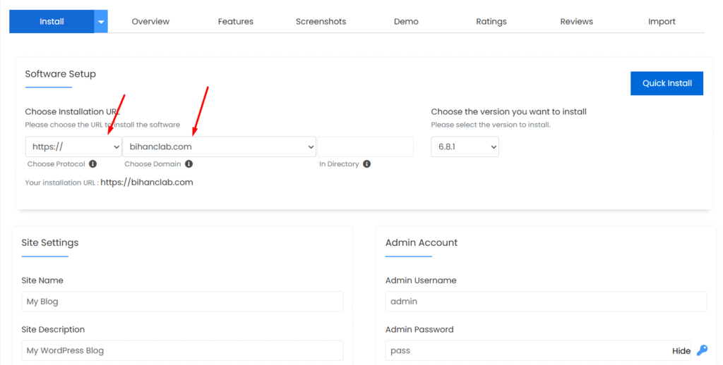 • Choose Intalation uRL – এখানে আপনি ড্রপ ডাউন মেণ্যুতে ক্লিক করে যে ডোমেইনে ইস্টল দিবেন।সে ডোমেইনটা সিলেক্ট করবেন। আর হ্যা তার আগে Choose Protocol এর জায়গাতে https:// টা সিলেক্ট করবেন। আর হ্যা Instalation Directory তে যদি কিছু লিখা থাকে তাহলে অবশ্যই সেটি রিমুভ করবেন। মানে এক কথায় ফাকা রাখবেন।