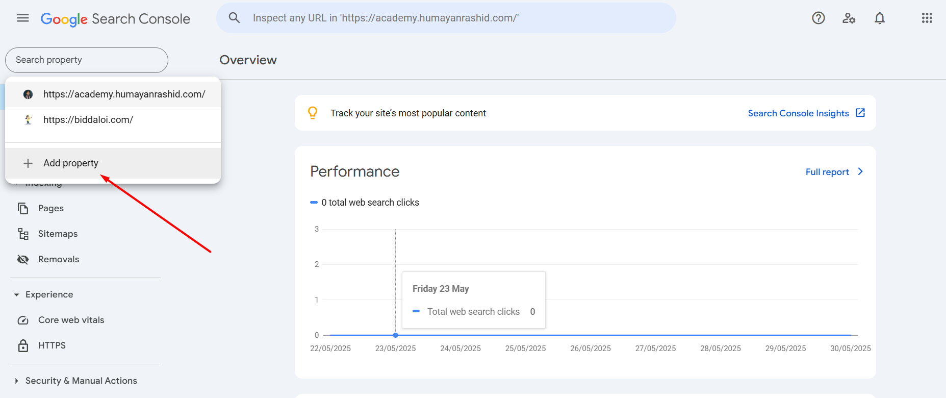 নোট – আপনার যদি আগে কোনো ওয়েবসাইট গুগলে সাবমিট করা না থাকে তাহলে আপনাকে ওই Box দেখাবে না।সোজাসোজি আপনাকে তাদের ওয়েবসাইট সাবমিট এর পেজে নিয়ে চলে যাবে।আমার যেহুতু আগে একটি ওয়েবসাইট সাবমিট করা আছে।সেহুতু আমাকে এই পেজে রেখে দিয়েছে।