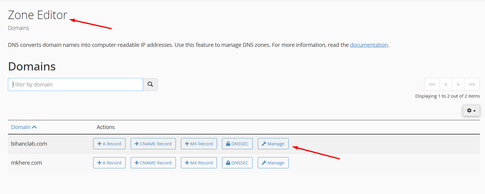 ৭। তারপর DNS Zone Editor এ যাবেন। য্বার পর যে ডোমেইনটি ভেরিফাই এর জন্য গুগলে সাবমিট করেছেন সে ডোমেইন এর অপশন থেকে Manage এ ক্লিক করুন।